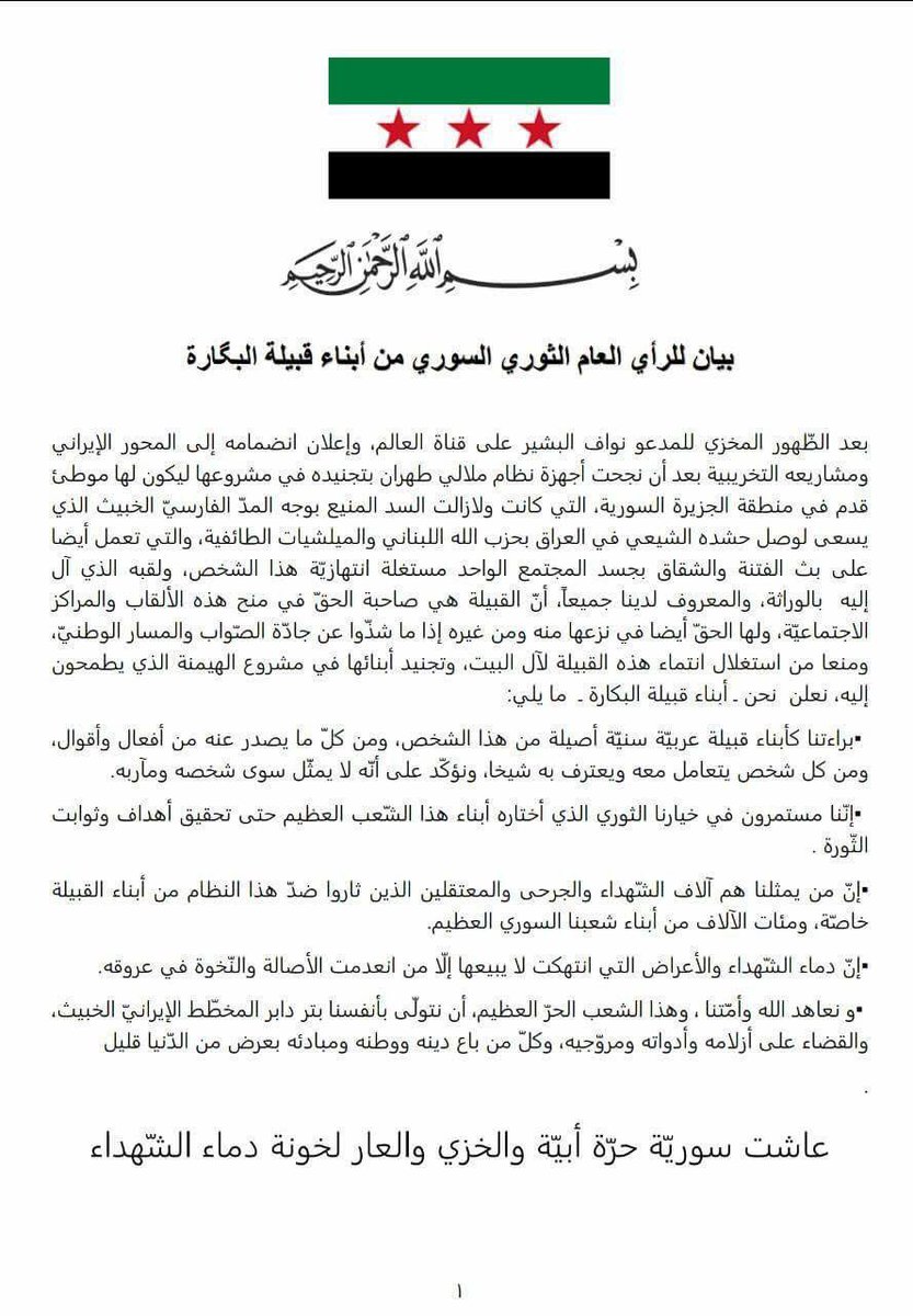 بيان للرأي العام الثوري السوري من أبناء قبيلة البكارة