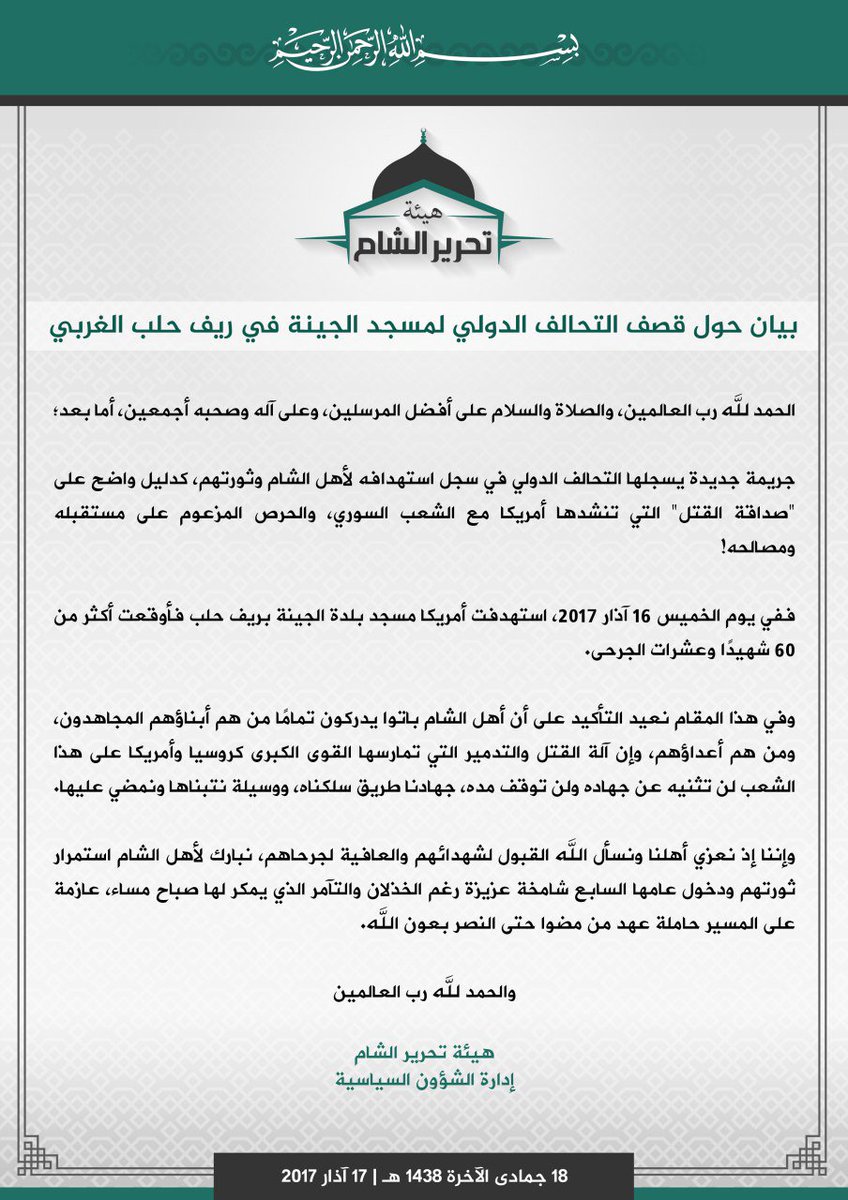 بيان تحرير الشام حول قصف التحالف الدولي لمسجد الجينة في ريف حلب الغربي