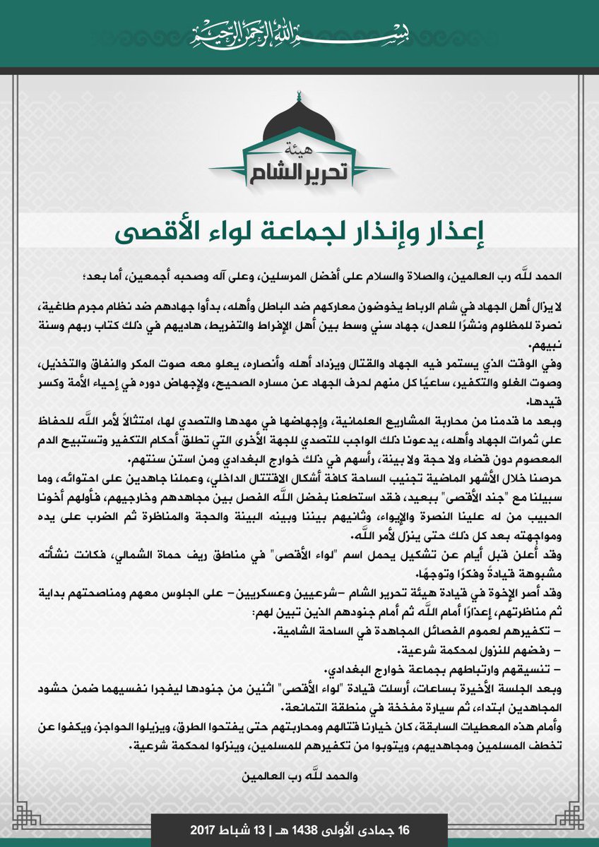 بيان هيئة تحرير الشام: إعذار وإنذار لجماعة لواء الأقصى