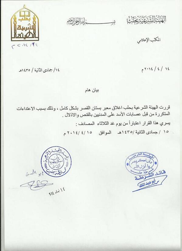 قررت الهيئة الشرعية بحلب اغلاق معبر بستان القصر بشكل كامل ، وذلك بسبب الاعتداءات