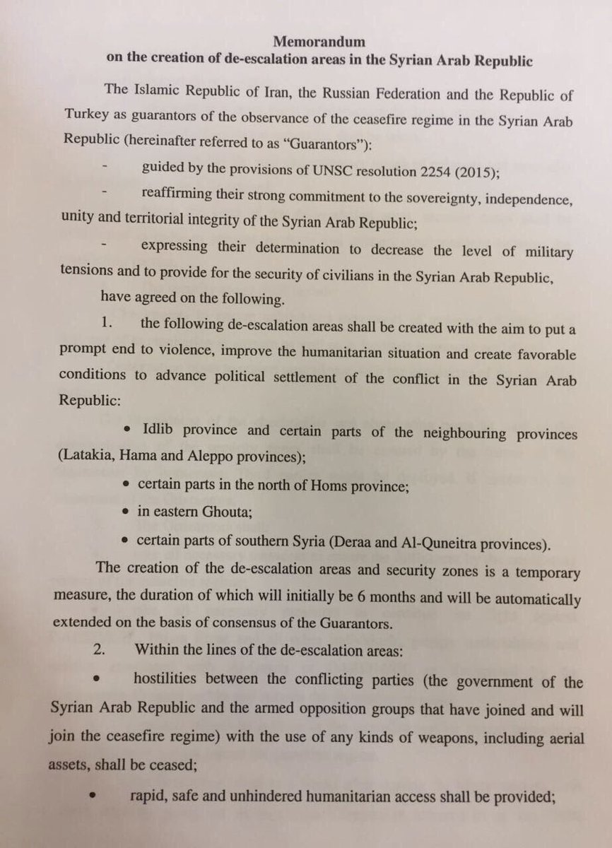 The Guarantors shall take steps to complete by 4 June 2017 the preparation of the maps of the de-escalation areas and security zones and to separate the armed opposition groups from the terrorist groups mentioned in para.5 of the Memorandum.