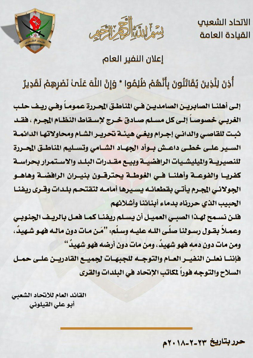 فإننا نعلن النفير العام والتوجه للجبهات لجميع القادرين على حمل السلاح والتوجه فوراً لمكاتب الاتحاد في البلدات والقرى