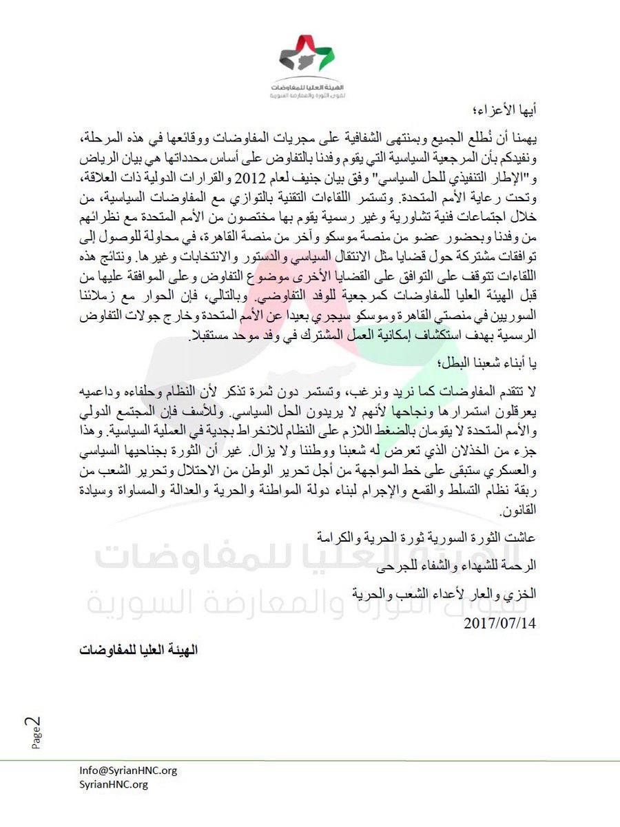 إنَّ الهيئة العليا للمفاوضات تعاهدكم على الالتزام بخط الثورة وعدم التنازل عن مبادئها وأهدافها، وأن تبقى مخلصة لثقتكم الغالية ومحافظة على المصلحة الوطنية العليا وكرامة سورية ووحدتها وحقوق مواطنيها على اختلاف انتماءاتهم ومكوناتهم، وهي إذ تمثل قوى الثورة و المعارضة السورية التي انخرطت في العملية السياسية فإنّها تخوض هذه المعركة تحت شعار الانتقال السياسي ومن أجله، وبالتالي فهي ترفض أيَّ عمل أو مشاريع أو مخططات تمس بالوحدة الوطنية، وتخدم أجندات خارجية على حساب سورية الوطن والشعب، ولذلك تصر على رحيل بشار الأسد وزمرته، وترفض أن يكون له أي دور في المرحلة الانتقالية وفي مستقبل البلاد، فالقتلة والمجرمون يذهبون إلى مكانهم الطبيعي تحت قوس العدالة.