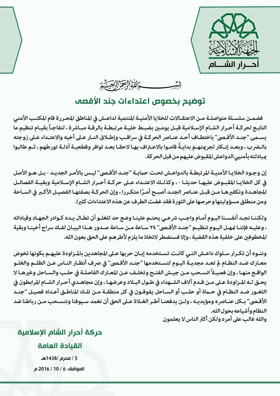 بيان حركة أحرار الشام بخصوص جند الأقصى