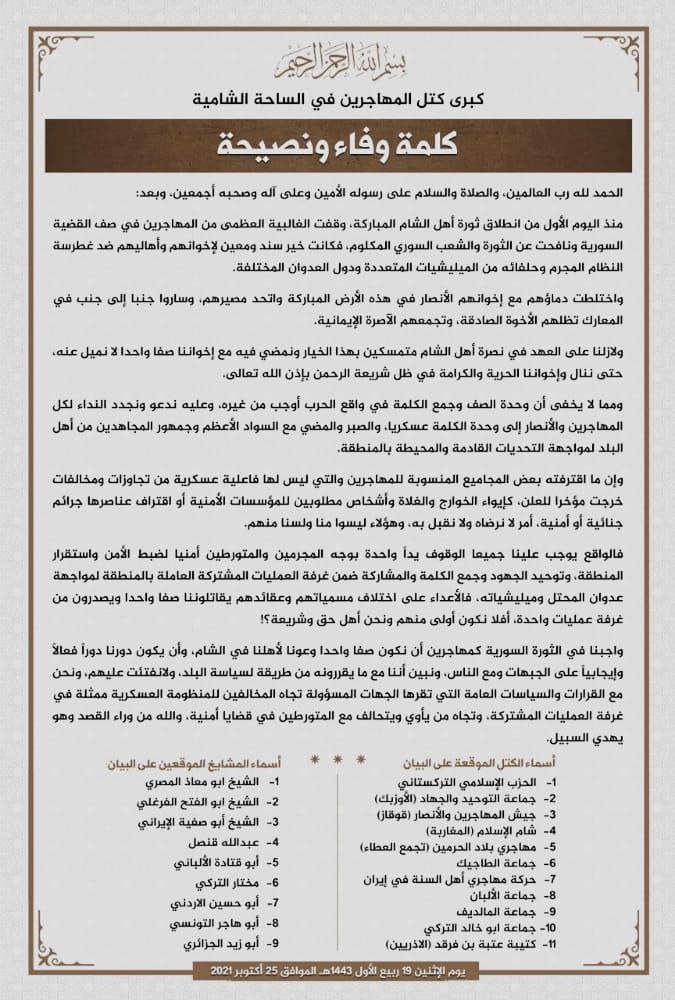 وما لا يخفى أن وحدة الصف وجمع الكلمة في واقع الحرب أوجب من غيره، وعليه ندعو ونجدد النداء لكل المهاجرين والأنصار إلى وحدة الكلمة عسكريا، والصبر والمضي مع السواد الأعظم وجمهور المجاهدين من أهل البلد لمواجهة التحديات القادمة والمحيطة بالمنطقة.