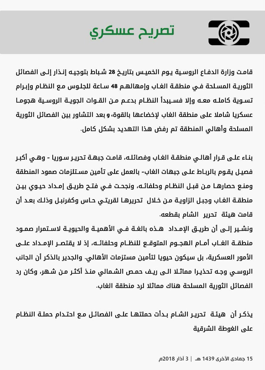 قامت وزارة الدفاع الروسية يوم الخميس بتاريخ 28 شباط بتوجيه إنذار إلى الفصائل الثورية المسلحة في منطقة الغاب وإمهالهم 48 ساعة للجلوس مع النظام وإبرام تسوية كاملـة معـه وإلا فسيبدأ النظام بدعم من القوات الجوية الروسية هجوما عسكريا شاملا على منطقة الغاب لإخضاعها بالقوة، و بعد التشاور بين الفصائل الثورية المسلحة وأهالي المنطقة تم رفض هذا التهديد بشكل كامل.
