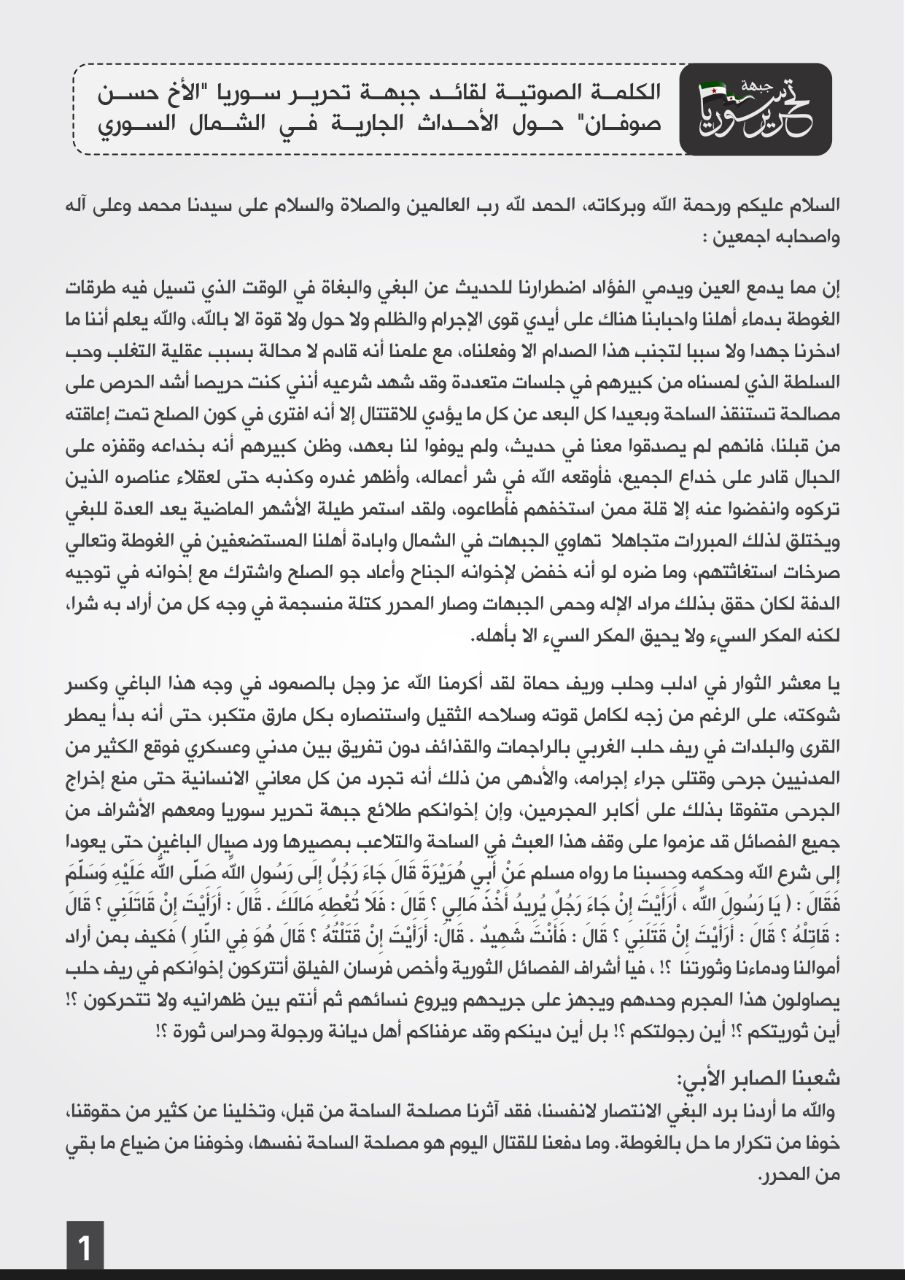 تفريغ نصي لكلمة قائد جبهة تحرير سوريا حسن صوفان حول القتال ضد هيئة تحرير الشام