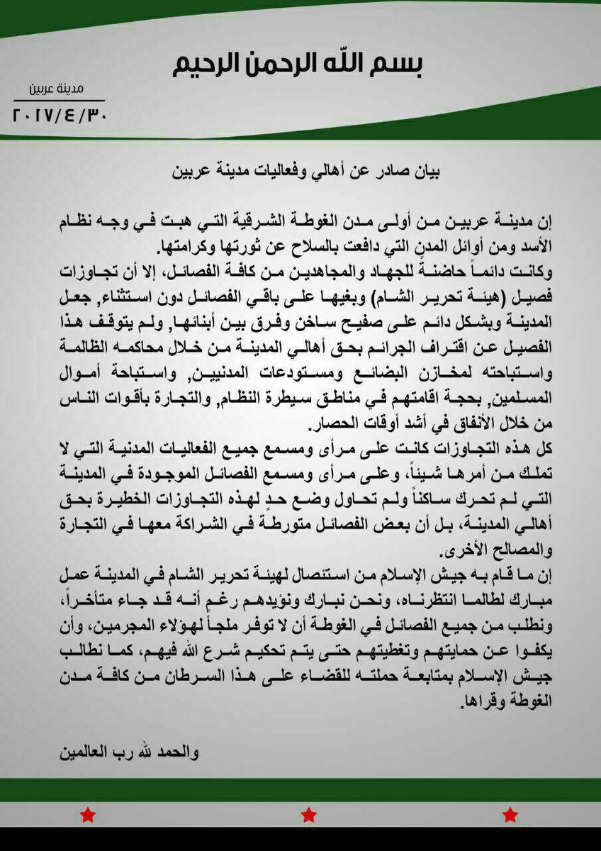 بيان منسوب لأهالي وفعاليات مدينة عربين يدين هيئة تحرير الشام ويرحب بعملية جيش الإسلام