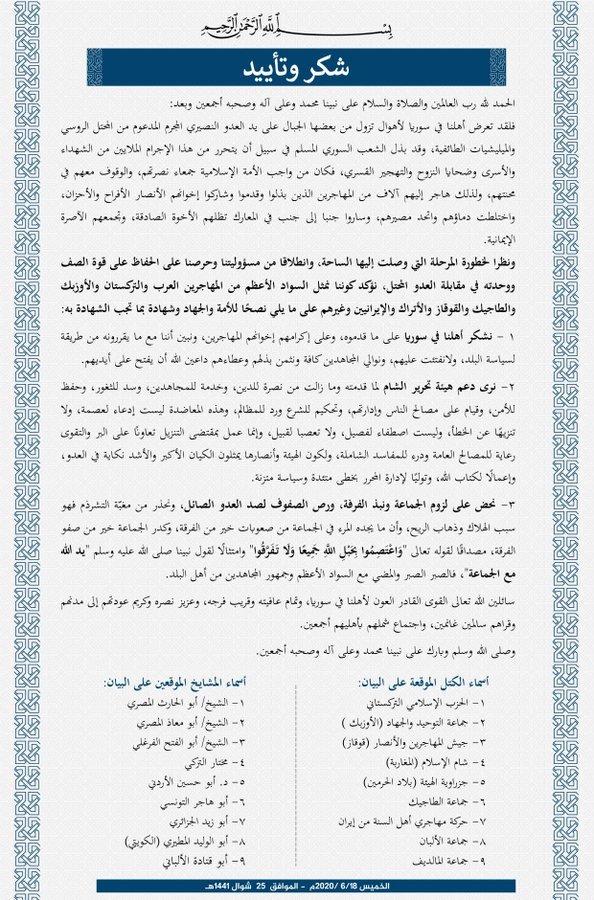 بيان مشايخ وكتل مهاجرين عرب وأجانب حول شكر وتأييد هيئة تحرير الشام