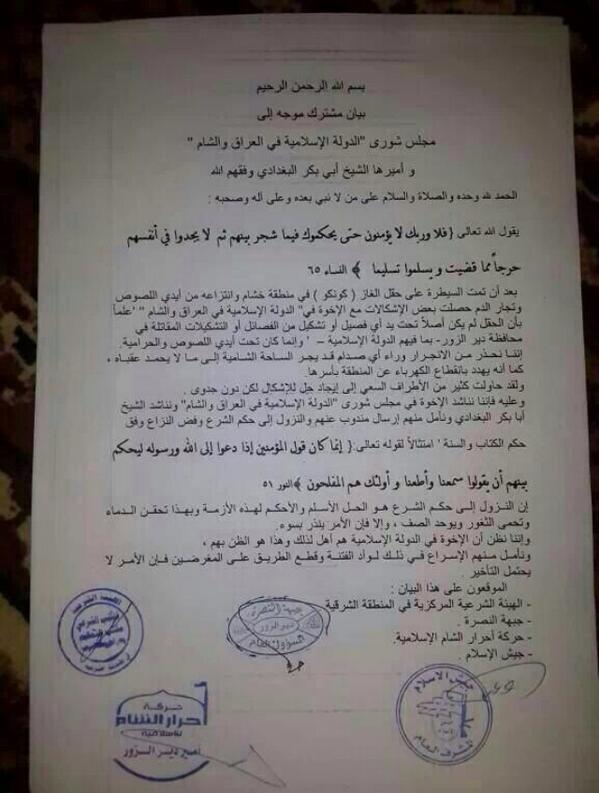 بيان مشترك من جيش الإسلام وجبهة النصرة وحركة أحرار الشام والهيئة الشرعية المركزية في المنطقة الشرقية إلى تنظيم "داعش" يدعو إلى محكمة شرعية لحل قضية حقل كونيكو للغاز