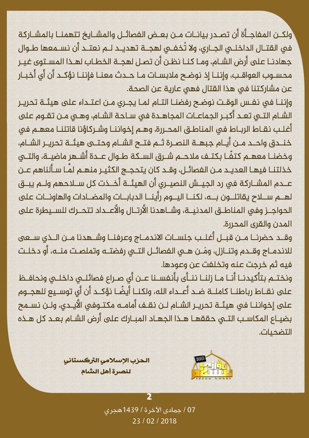 ونختم بتأكيدنا أننا ما زلنا ننأى بأنفسنا عن أي صراع فصائلي داخلي ونحافظ على نقاط رباطنا كاملة ضد أعداء الله، ولكنا أيضًا نؤكد أن أي توسيع للهجوم على إخواننا في هيئة تحرير الشام لن نقف أمامه مكتوفي الأيدي، ولن نسمح بضياع المكاسب التي حققها هذا الجهاد المبارك على أرض الشام بعد كل هذه التضحيات.