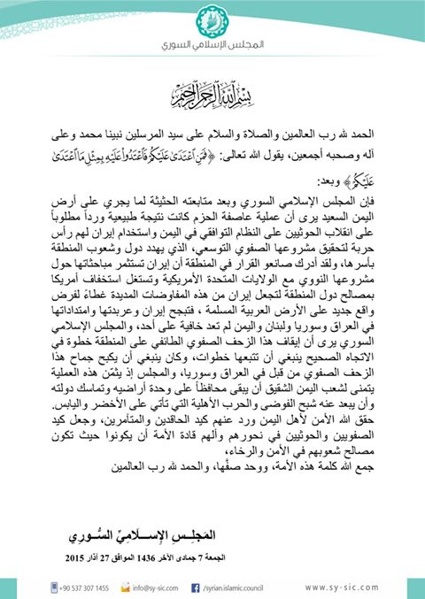 بيان من المجلس الإسلامي السوري يرحب فيه بعملية عاصفة الحزم في اليمن