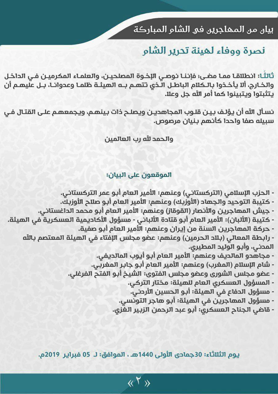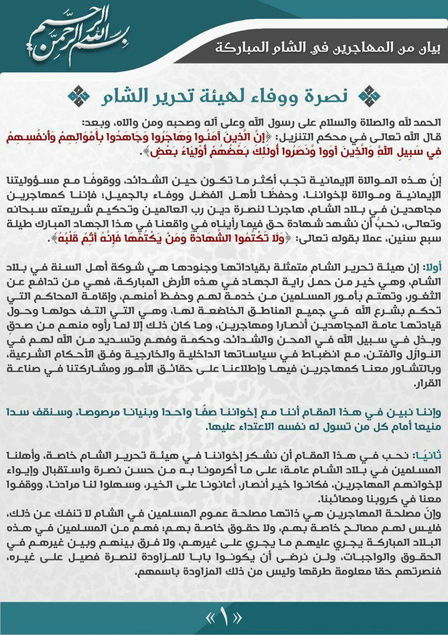 بيان من المهاجرين في الشام المباركة: نصرة ووفاء لهيئة تحرير الشام