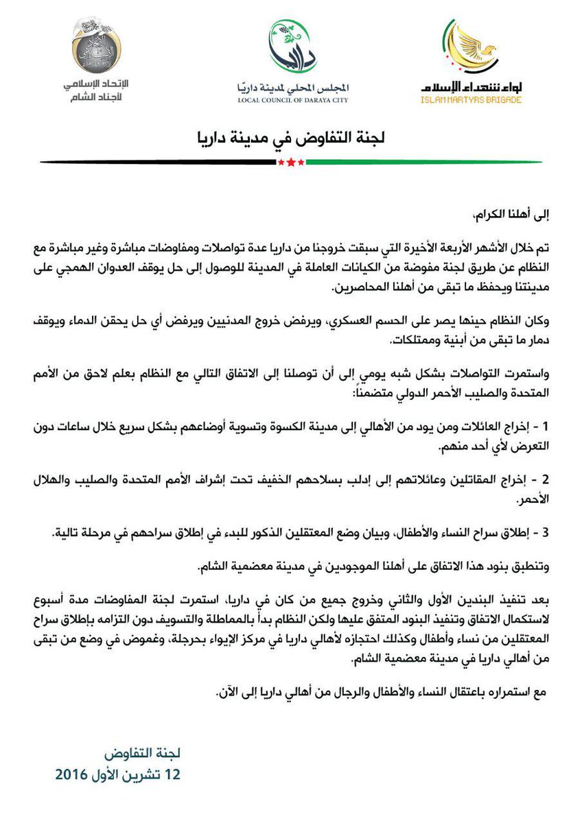 وتنطبق بنود هذا الاتفاق على أهلنا الموجودين في مدينة معضمية الشام.