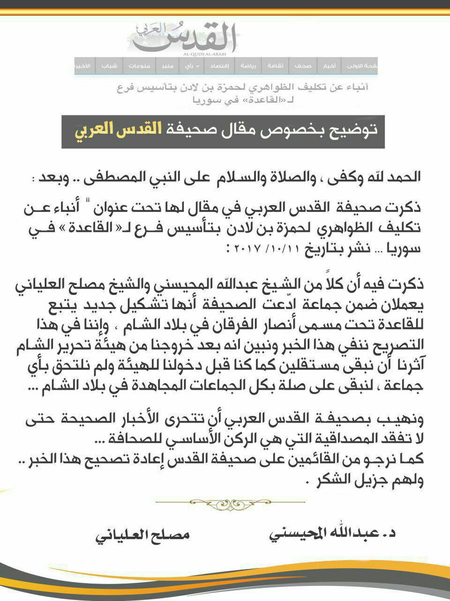 بيان من مصلح العلياني وعبد الله المحيسني ينفيان مشاركتهما في تأسيس فرع للقاعدة في سورية