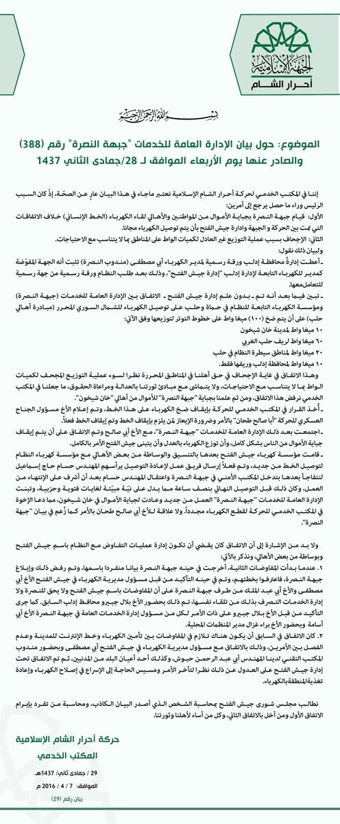 بيان نفي من حركة أحرار الشام الإسلامية حول بيان الإدارة العامة للخدمات "جبهة النصرة" رقم (388)
