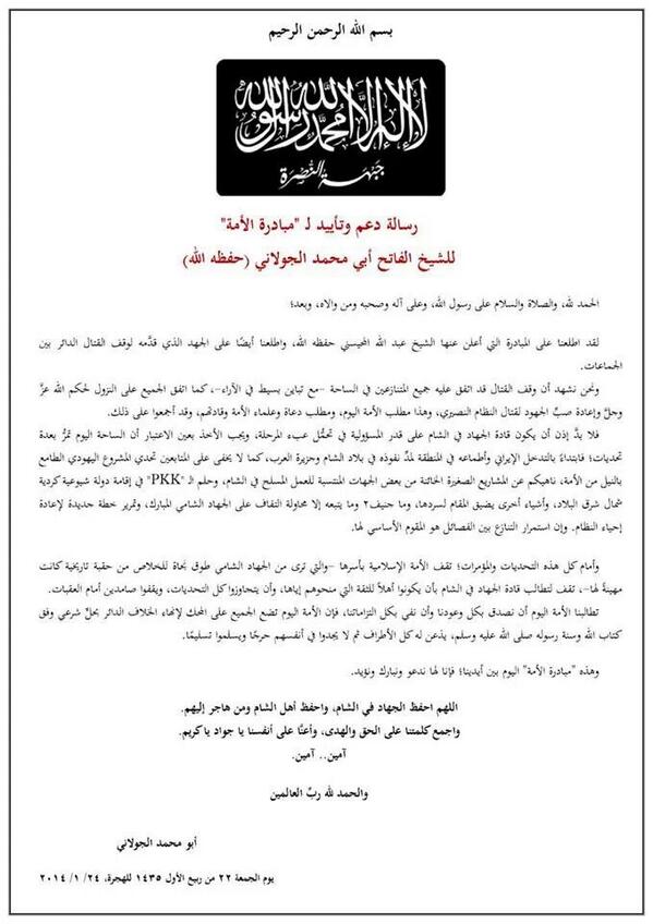 رسالة دعم وتأيد لمبادرة الأمة من زعيم جبهة النصرة "أبو محمد الجولاني"