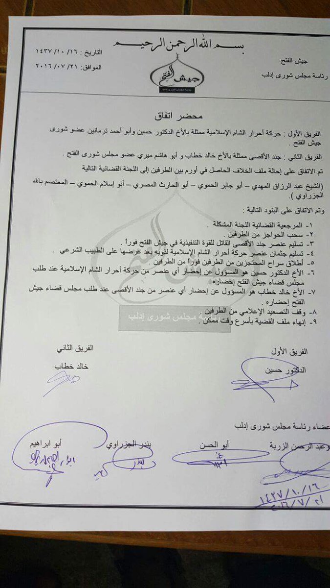 محضر اتفاق حركة أحرار الشام الإسلامية وجند الأقصى لحل الخلاف في أورم