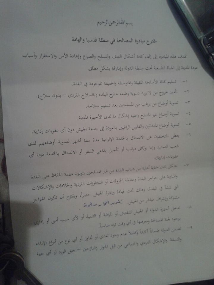 بنود مقترح مبادرة المصالحة في منطقة قدسيا والهامة