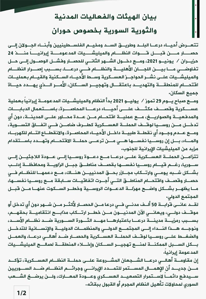 بيان الهيئات و الفعاليات المدنية والثورية بخصوص حوران - 2021