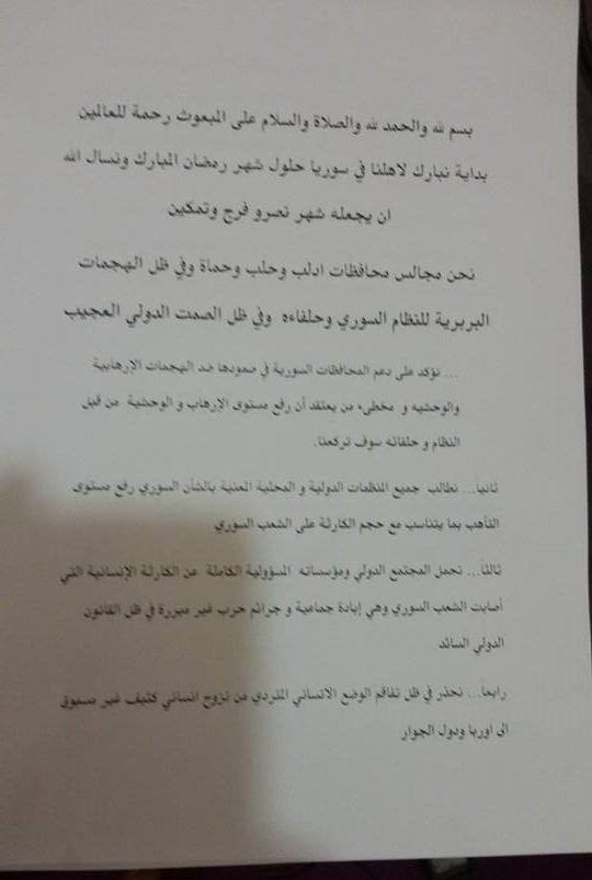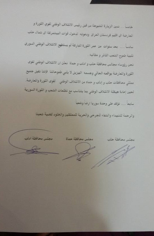 بيان مشترك منسوب لمجالس محافظات حلب وإدلب وحماة حول الوضع الإنساني المتفاقم وزيارة الائتلاف لإقليم كردستان العراق