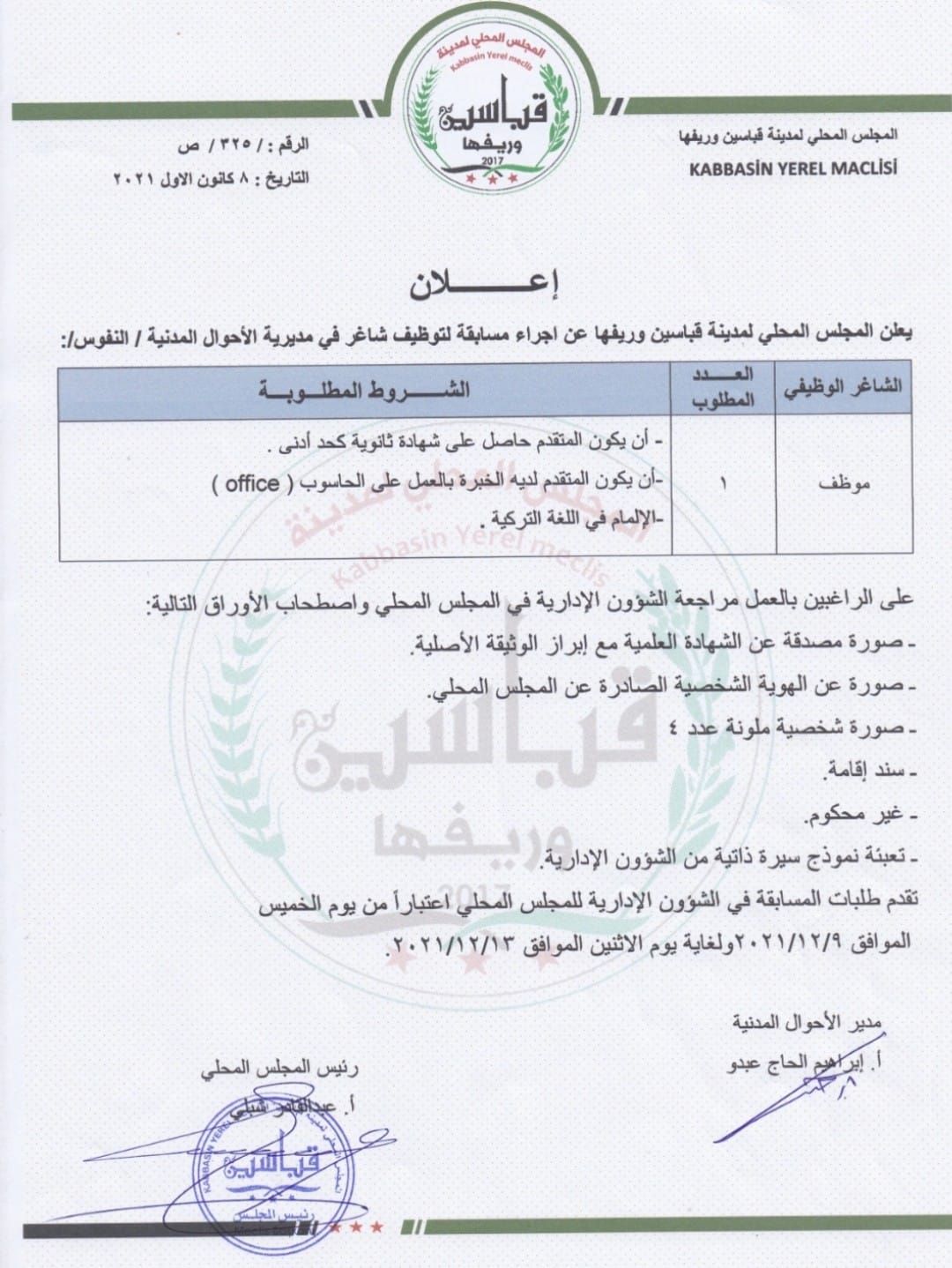 إعلان المجلس المحلي لمدينة قباسين وريفها للتوظيف في شاغر في مديرية الأحوال المدنية