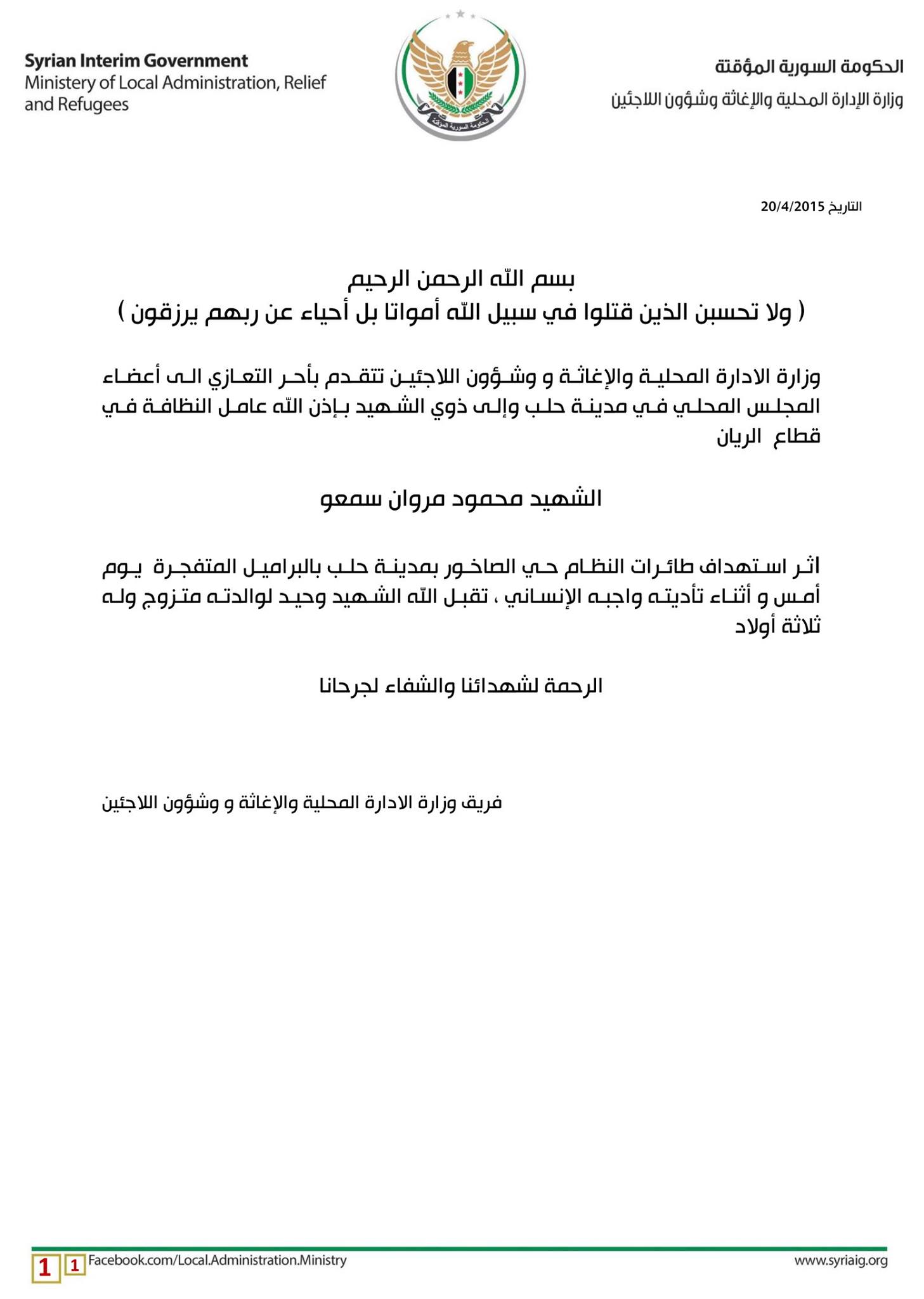بيان زارة الإدارة المحلية والإغاثة واللاجئين في الحكومة المؤقتة لتعزية المجلس المحلي في مدينة حلب بعامل نظافة قتل ببرميل متفجر