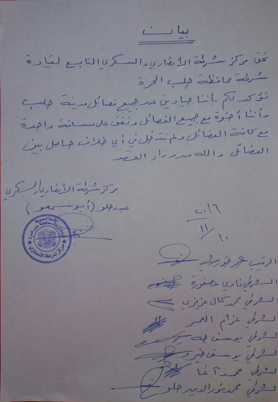 بيان مركز شرطة الأنصاري والسكري التابعة للشرطة الحرة في مدينة حلب حول استقلالها وعدم تحيزها