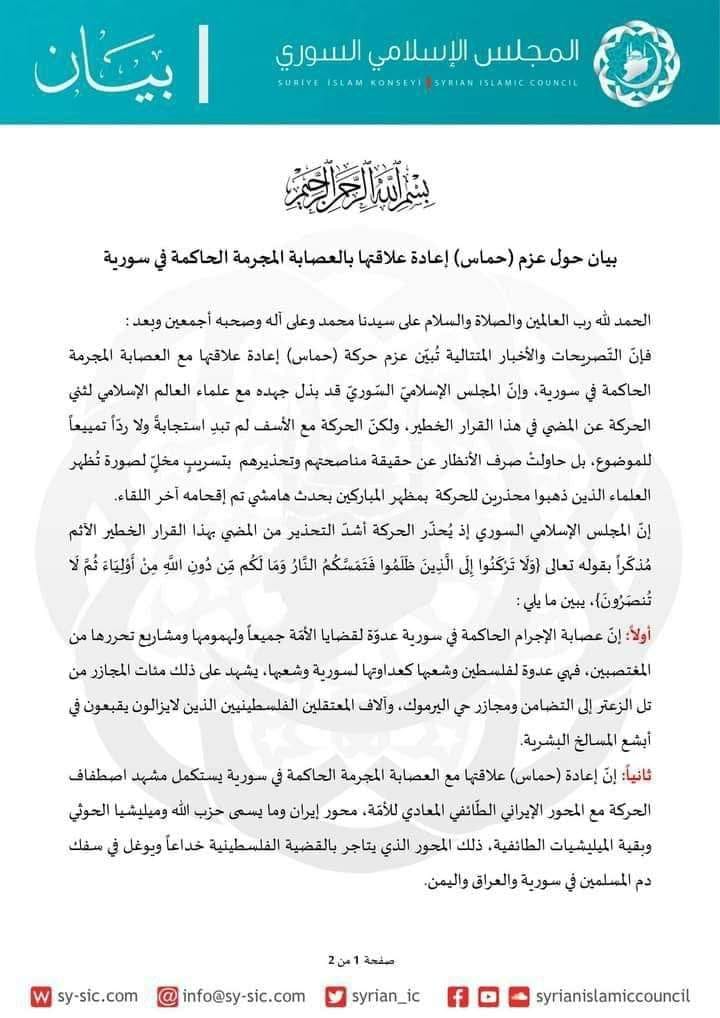 بيان المجلس الإسلامي السوري حول عزم حركة حماس إعادة علاقاتها مع نظام الأسد