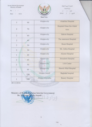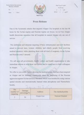 Due to the Systematic attacks that targeted Aleppo City hospitals in the last 48 hours by the Syrian regime and Russian regime air forces, we in Free Aleppo health directorate announce that all hospitals in castern Aleppo city are out of service.