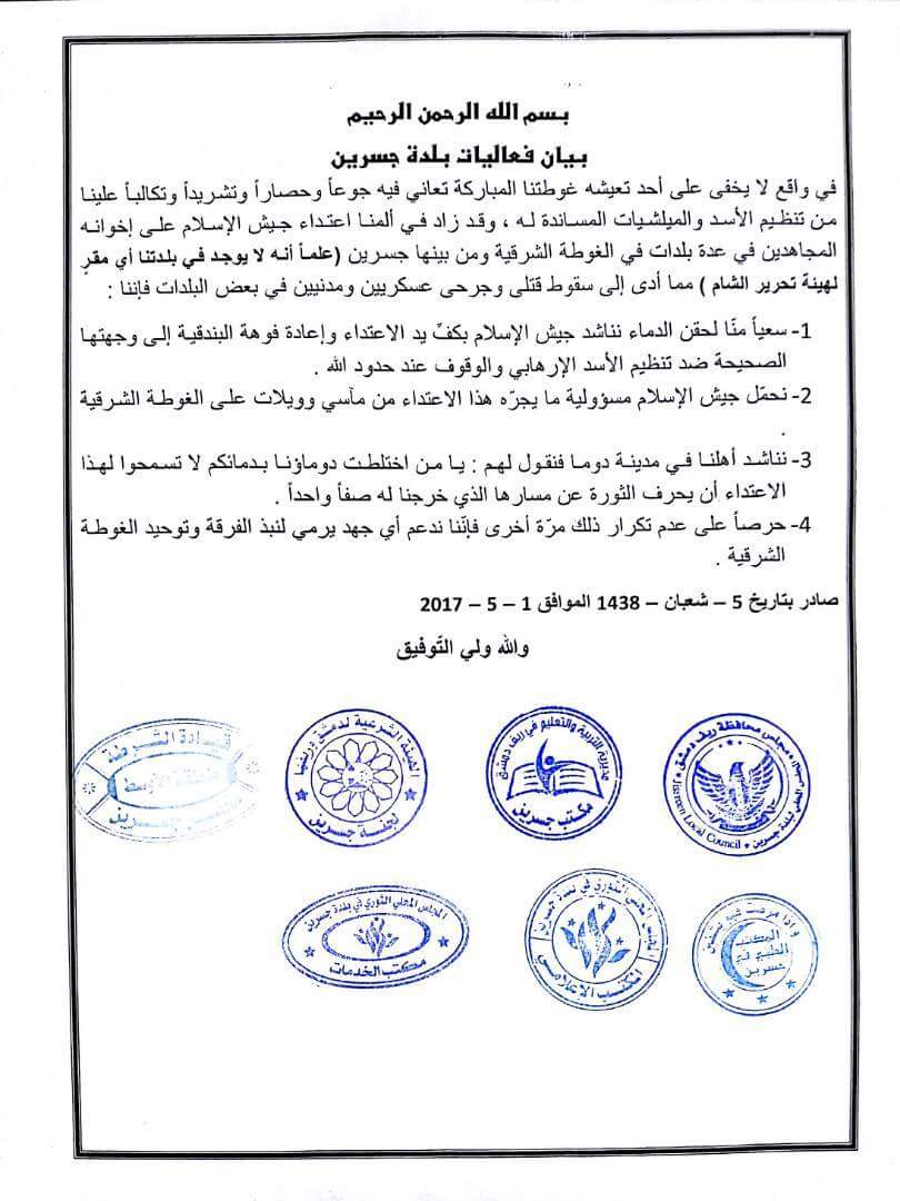 في واقع لا يخفى على أحد تعيشه غوطتنا المباركة نعاني فيه جوعاً وحصاراً وتشريداً وتنكُّلاً علينا من تنظيم الأسد والميليشيات المساندة له، وقد زاد في ألمنا اعتداء جيش الإسلام على إخوانه المجاهدين في عدة بلدات في الغوطة الشرقية ومن بينها جسرين (علماً أنه لا يوجد في بلدتنا أي مقر لهيئة تحرير الشام) مما أدى إلى سقوط قتلى وجرحى عسكريين ومدنيين في بعض البلدات فإننا: