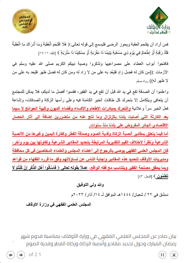 بيان المجلس الفقهي التابع لوزارة الأوقاف في دمشق حول مقدار صدقة الفطر وفدية الصيام في رمضان 2023
