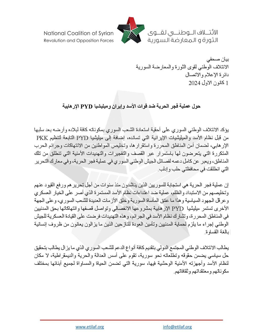 يؤكد الائتلاف الوطني السوري على أحقية استعادة الشعب السوري بمكوناته كافة لبلاده وأرضه بعد سلبها من قبل نظام الأسد والميليشيات الإيرانية التي تسانده، إضافة إلى ميليشيا PYD التابعة لتنظيم PKK الإرهابي، لضمان أمن المناطق المحررة واستقرارها، وتخليص المواطنين من الانتهاكات وجرائم الحرب المتكررة التي يتعرضون لها باستمرار عبر القصف والتفجيرات والتهديدات الأمنية التي تنطلق من تلك المناطق، ويعبر عن كامل دعمه لفصائل الجيش الوطني السوري في عملية فجر الحرية، وفي معارك التحرير التي انطلقت في محافظتي حلب وإدلب.