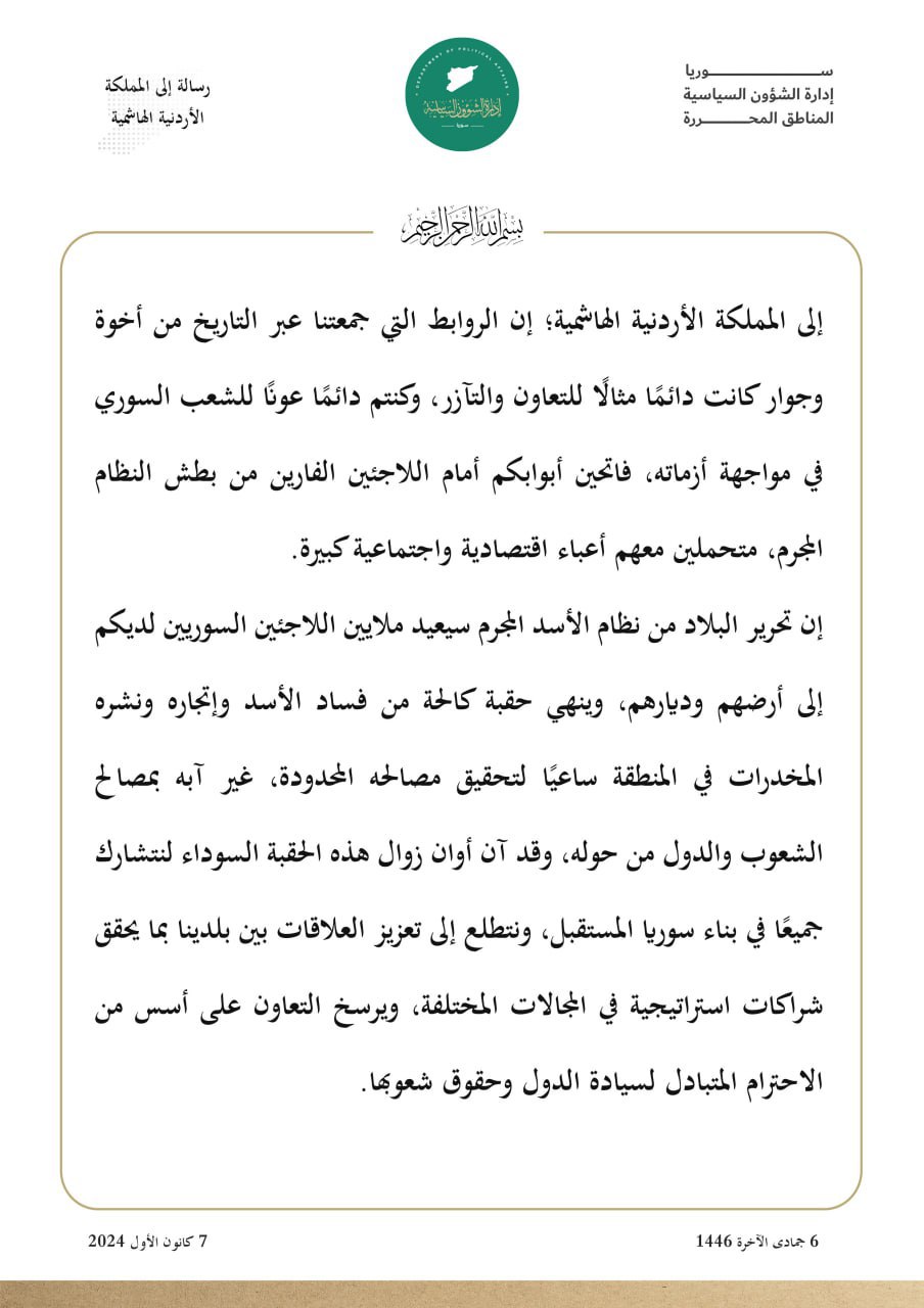 رسالة من "إدارة الشؤون السياسية" إلى المملكة الأردنية الهاشمية
