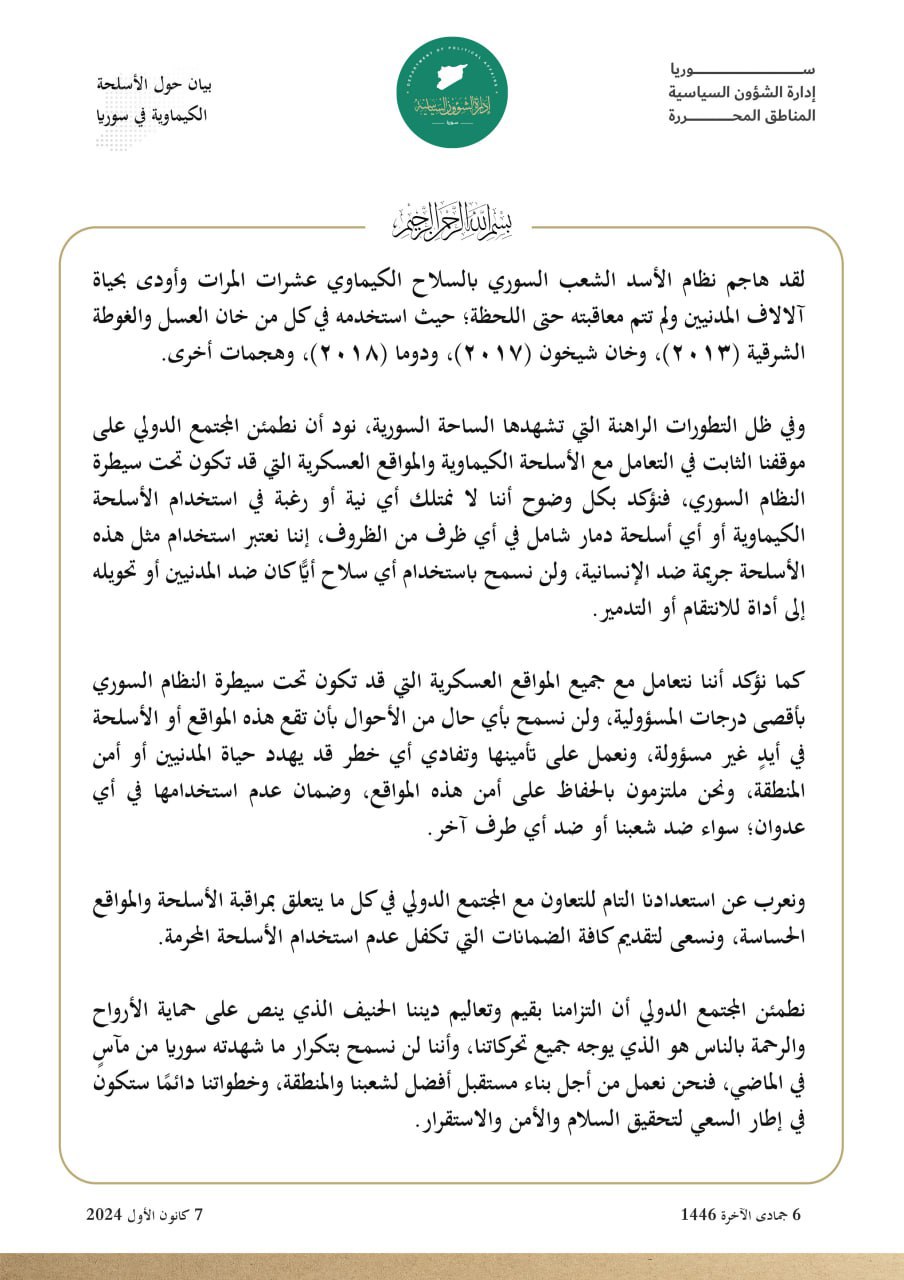 بيان من "إدارة الشؤون السياسية" حول الأسلحة الكيماوية في سورية
