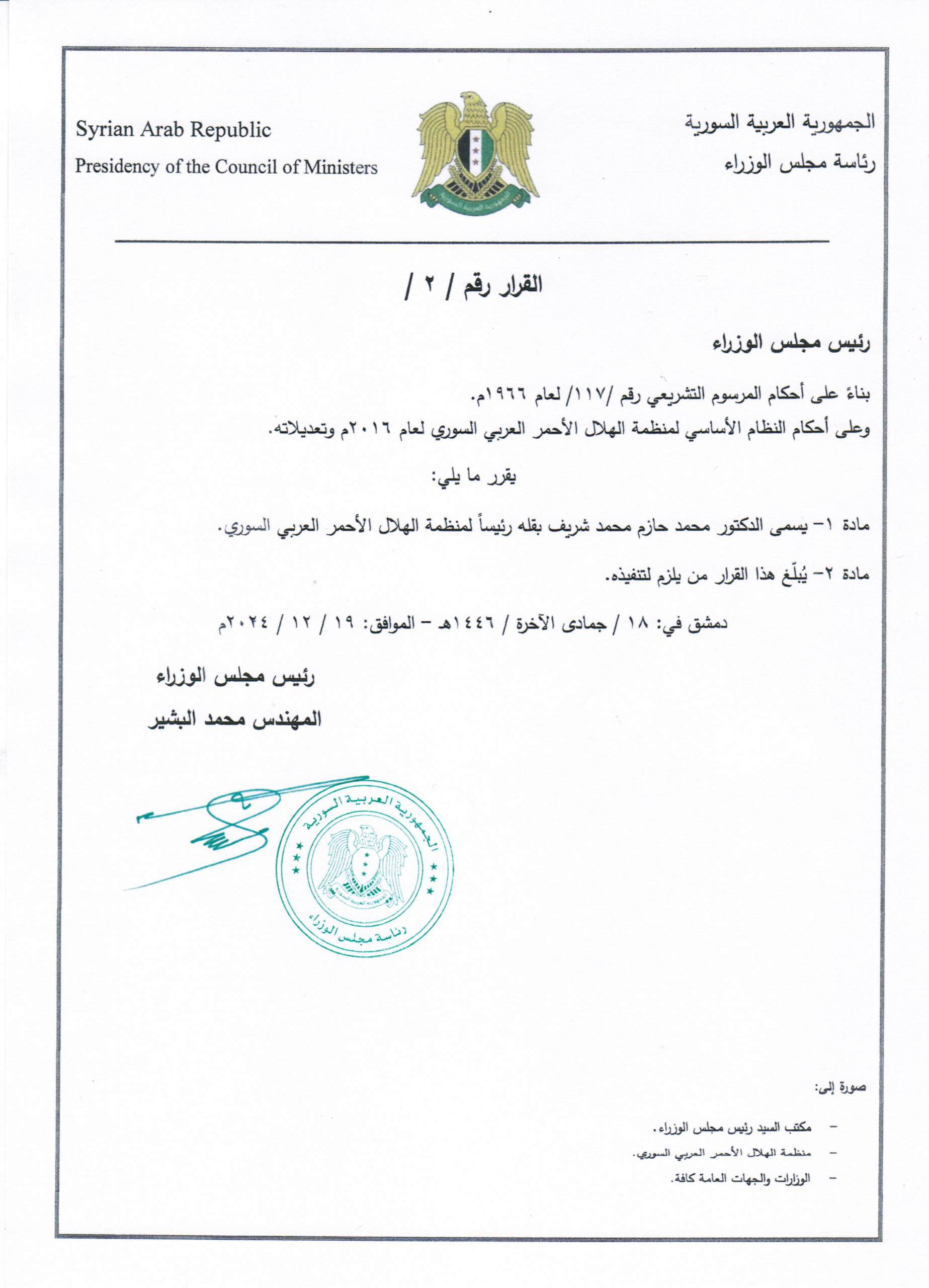 قرار بتكليف الدكتور "محمد حازم محمد شريف بقله" رئيساً لمنظمة الهلال الأحمر العربي السوري