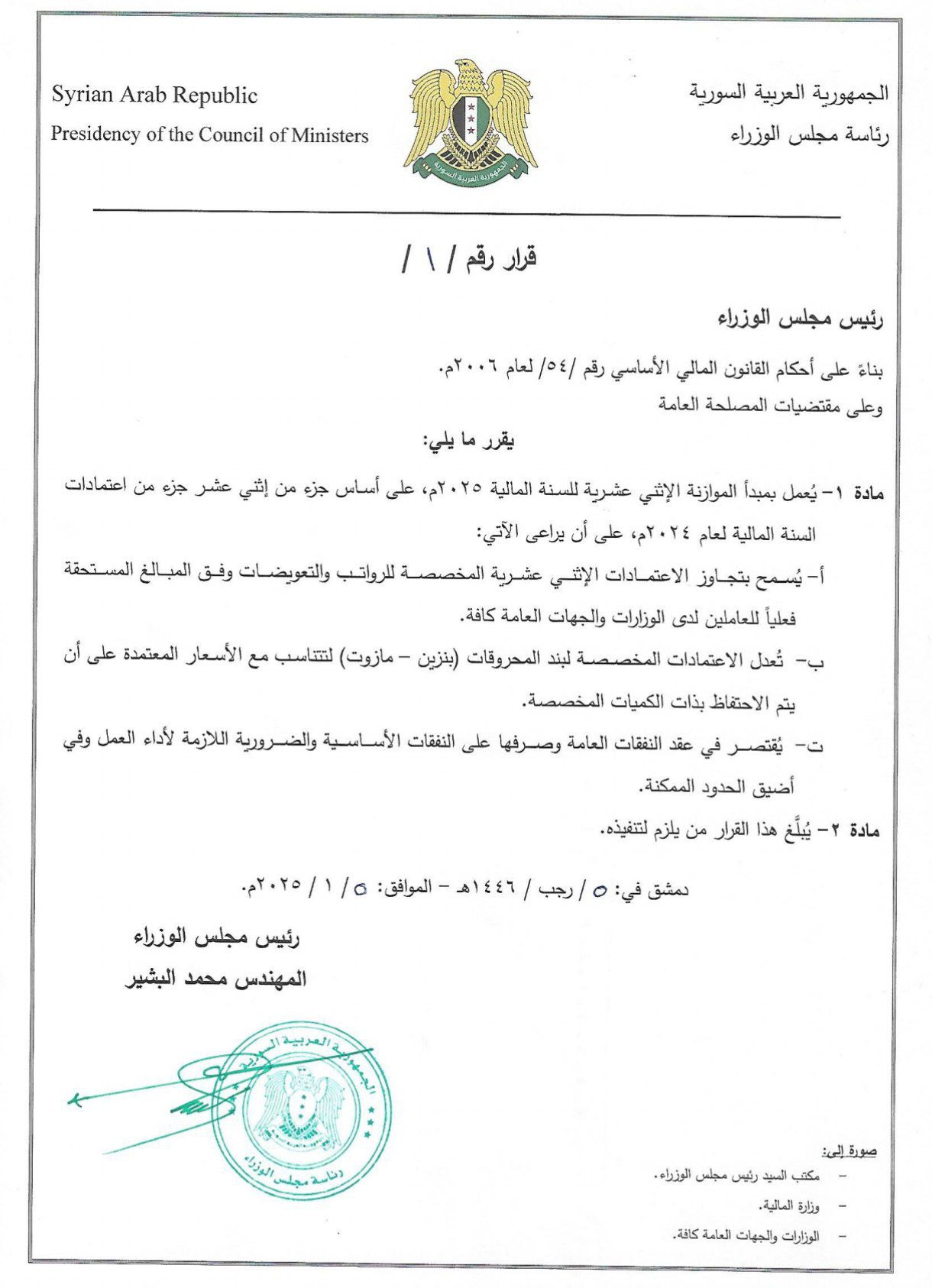 دمشق في : ٥ / رجب / ١٤٤٦هـ - الموافق : ٥ / ١ / ٢٠٢٥م.