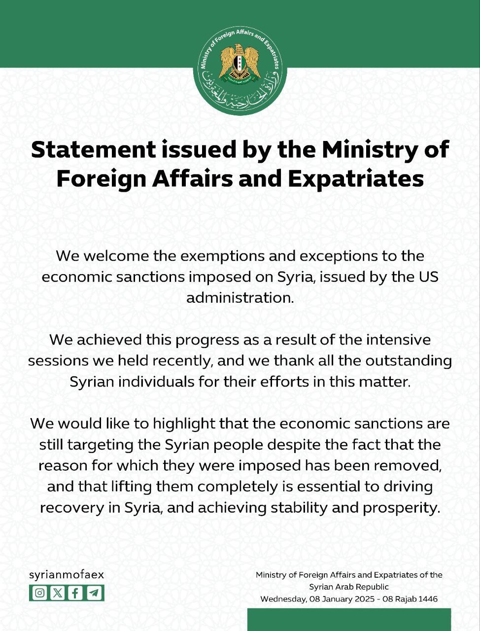 بيان صادر عن وزارة الحارجية والمغتربين في الجمهورية العربية السورية ترحب فيه بالاعفاءات والاستثناءات المتعلقة بالعقوبات الاقتصادية المفروضة على سورية الصادرة عن الادارة الأمريكية