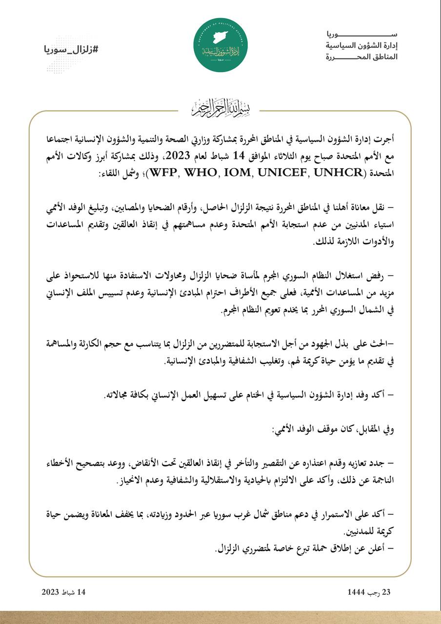 أجرت #إدارة_الشؤون_السياسية في المناطق المحررة بمشاركة وزارتي الصحة والتنمية والشؤون الإنسانية اجتماعا مع الأمم المتحدة صباح يوم الثلاثاء الموافق 14 شباط لعام 2023، وذلك بمشاركة أبرز وكالات الأمم المتحدة (WFP, WHO, IOM, UNICEF, UNHCR)؛ وشمل اللقاء:
