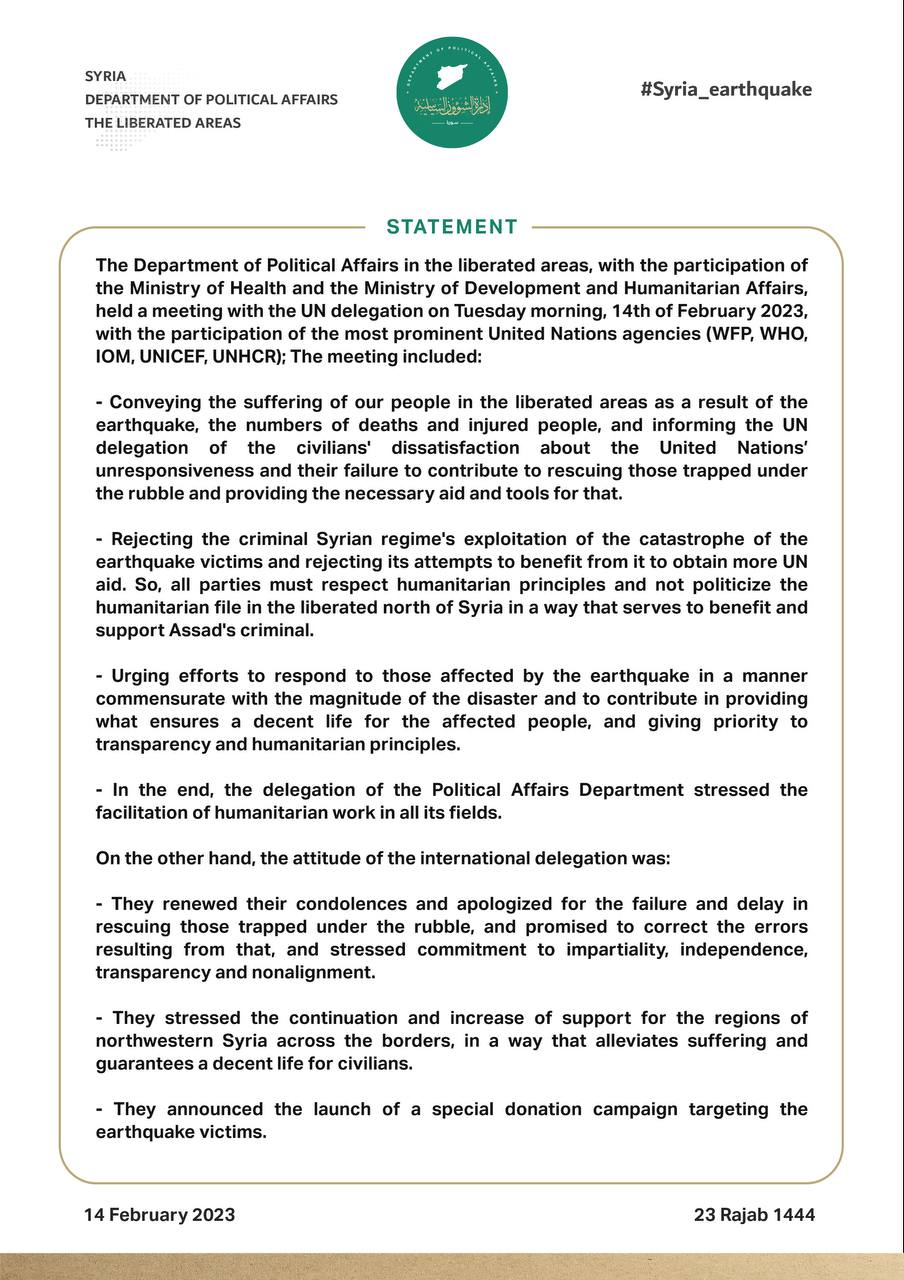 Rejecting the criminal Syrian regime's exploitation of the catastrophe of the earthquake victims and rejecting its attempts to benefit from it to obtain more UN aid. So, all parties must respect humanitarian principles and not politicize the humanitarian file in the liberated north of Syria in a way that serves to benefit and support Assad's criminal.