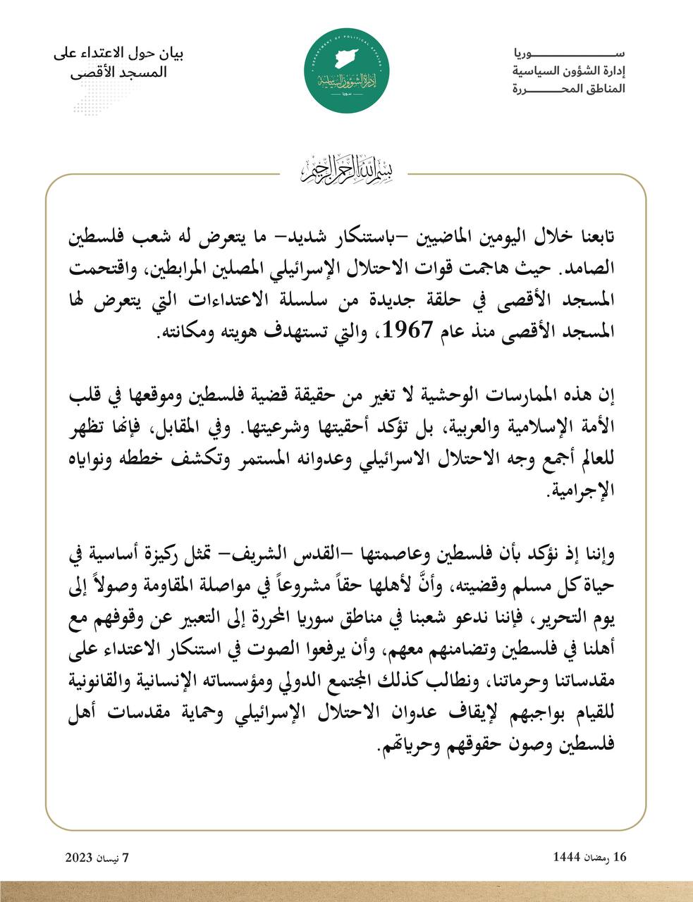 وإننا إذ نؤكد بأن فلسطين وعاصمتها - القدس الشريف - تمثل ركيزة أساسية في حياة كل مسلم وقضيته، وأنَّ لأهلها حقاً مشروعاً في مواصلة المقاومة وصولاً إلى يوم التحرير، فإننا ندعو شعبنا في مناطق سوريا المحررة إلى التعبير عن وقوفهم مع أهلنا في فلسطين وتضامنهم معهم، وأن يرفعوا الصوت في استنكار الاعتداء على مقدساتنا وحرماتنا، ونطالب كذلك المجتمع الدولي ومؤسساته الإنسانية والقانونية للقيام بواجبهم لإيقاف عدوان الاحتلال الإسرائيلي وحماية مقدسات أهل فلسطين وصون حقوقهم وحرياتهم.