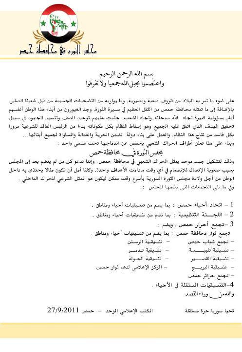 بيان تشكيل مجلس الثورة في محافظة حمص