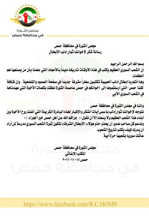رسالة شكر لإخواننا ثوار إدلب الأبطال من مجلس الثورة في محافظة حمص