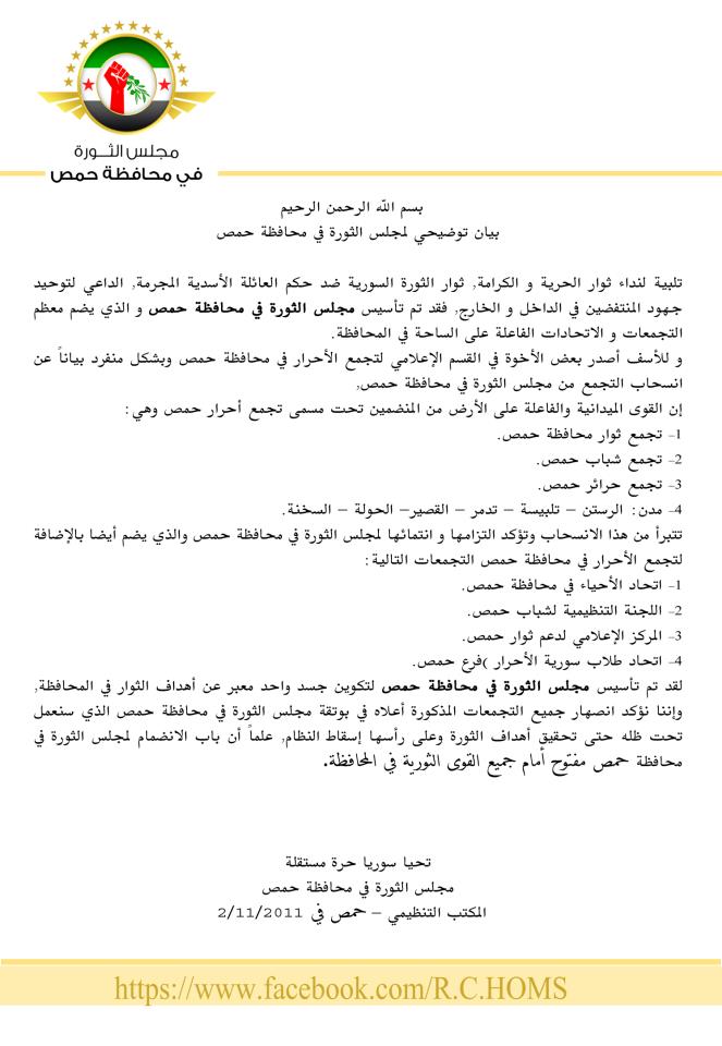 بيان توضيحي لمجلس الثورة في محافظة حِمِص