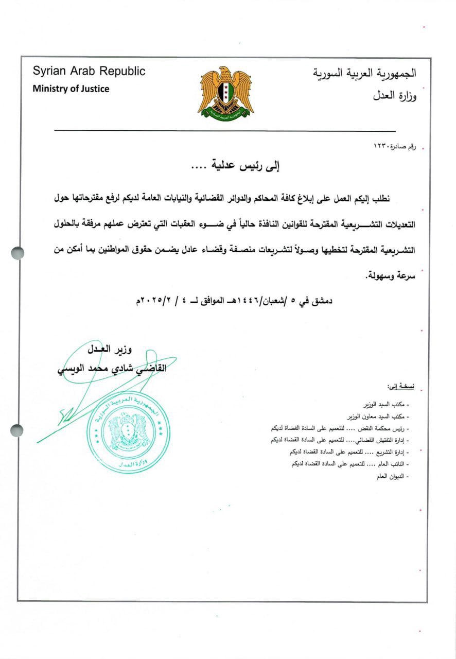 نطلب إليكم العمل على إبلاغ كافة المحاكم والدوائر القضائية والنيابات العامة لديكم لرفع مقترحاتها حول التعديلات التشريعية المقترحة للقوانين النافذة حاليًا في ضوء العقبات التي تعترض عملهم مرفقة بالحلول التشريعية المقترحة لتخطيها وصولًا لتشريعات منصفة وقضاء عادل يضمن حقوق المواطنين بما أمكن من سرعة وسهولة.