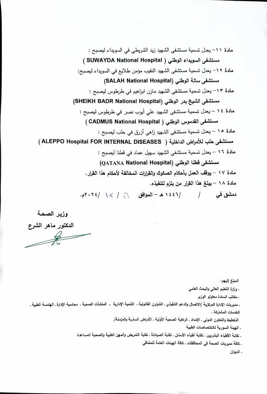 مادة ١٦ - يعدل تسمية مستشفى الشهيد سهيل عماد في قطنا ليصبح : )QATANA National Hospital( مستشفى قطنا الوطني