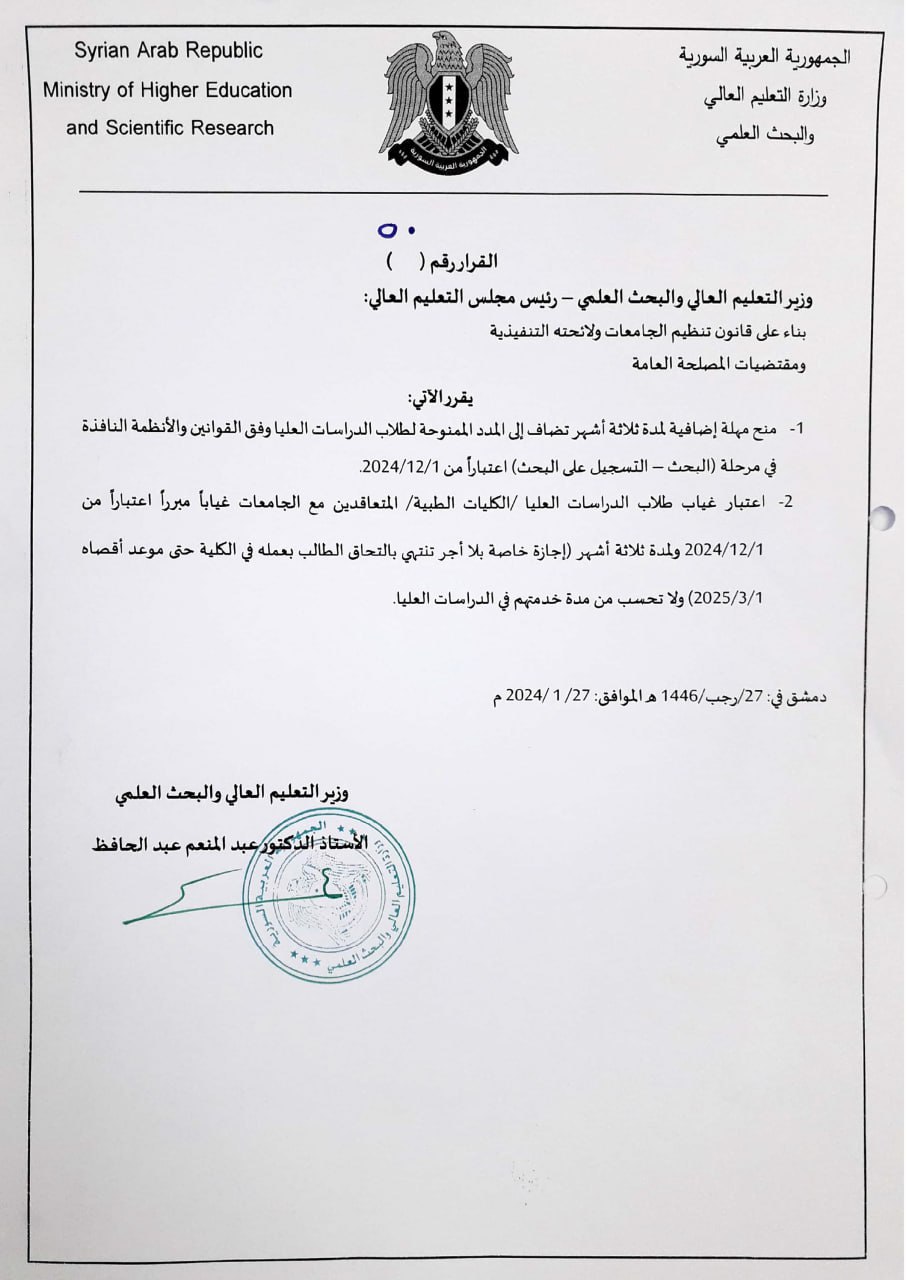 -1- منح مهلة إضافية لمدة ثلاثة أشهر تضاف إلى المدد الممنوحة لطلاب الدراسات العليا وفق القوانين والأنظمة النافذة في مرحلة البحث - التسجيل على البحث) اعتباراً من 2024/12/1.