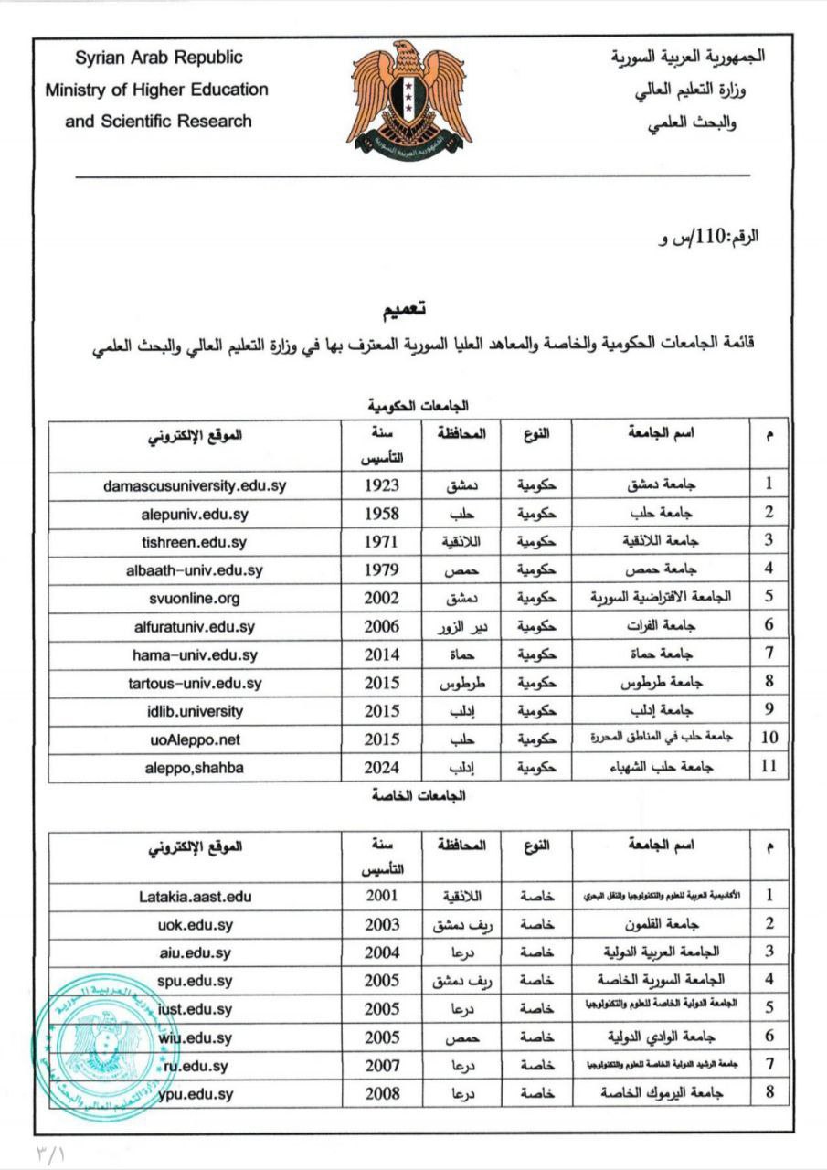 أصدرت وزارة التعليم العالي والبحث العلمي في الجمهورية العربية السورية القرار رقم 110/س و، المتضمن قائمة الجامعات الحكومية والخاصة والمعاهد العليا المعترف بها رسميًا.