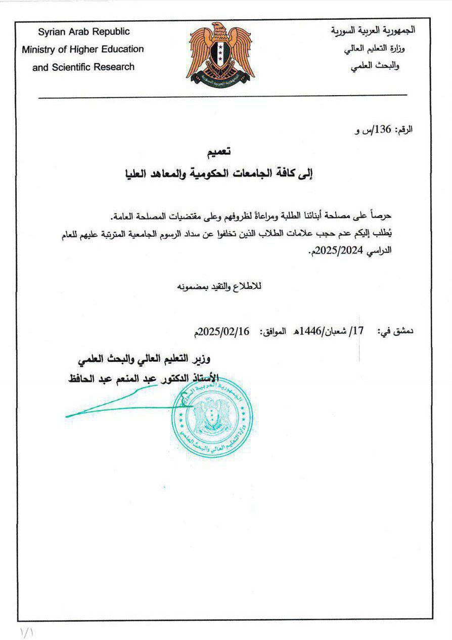 إلى كافة الجامعات الحكومية والمعاهد العليا