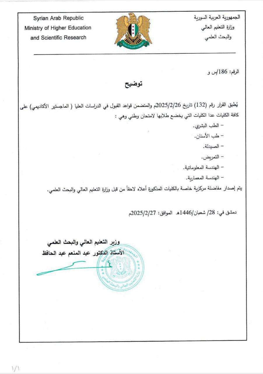 وزارة التعليم العالي والبحث العلمي توضح القرار (132) بتاريخ 26/2/2025
